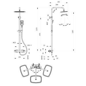 | Components | Thermostatic mixer,Shower rail, Hand shower holder,Overhead shower,With 3-mode hand shower, Shower hose,Installation accessories, Installation instructions |